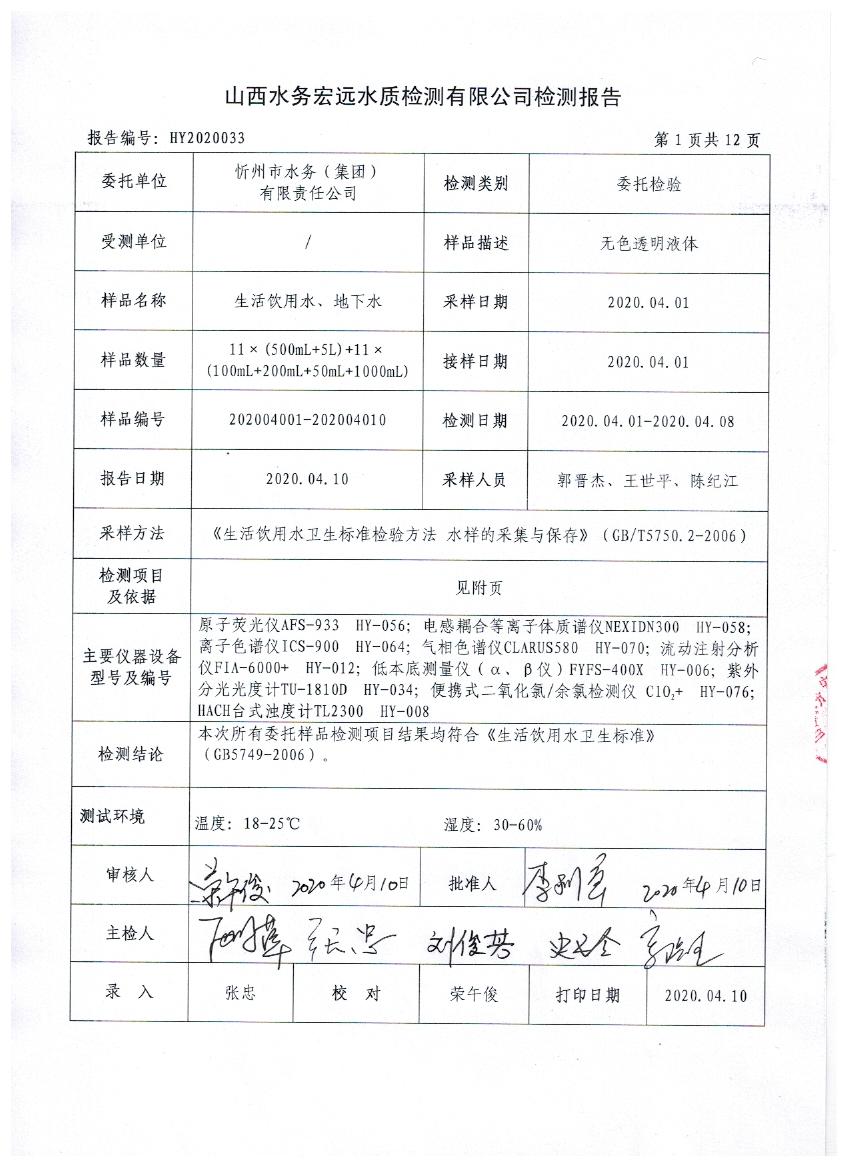 忻州城區(qū)公共供水水源水、出廠水、管網(wǎng)水、管網(wǎng)末梢水2020年4月份水質(zhì)信息公示