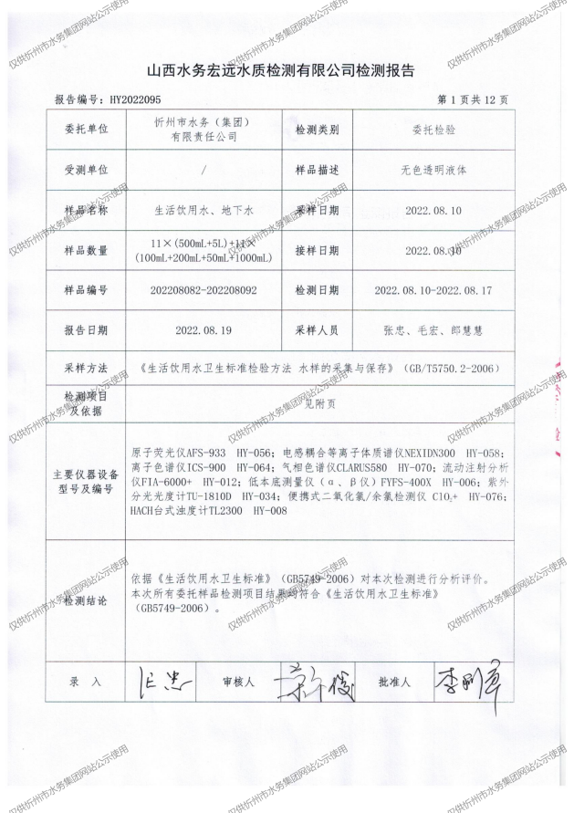 忻州城區(qū)公共供水水源水、出廠水、管網(wǎng)水、管網(wǎng)末梢水2022年8月份水質(zhì)信息公示