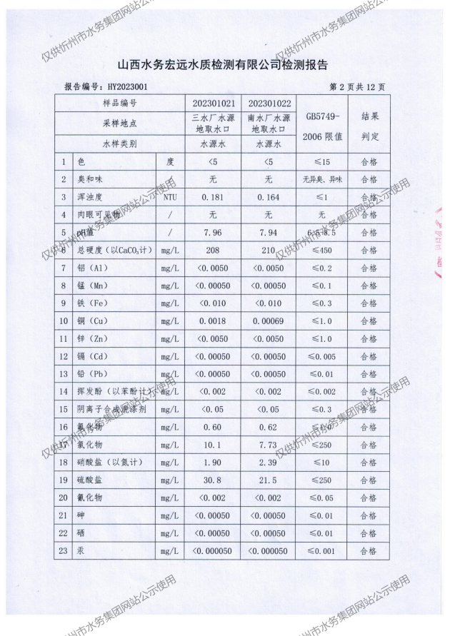 忻州城區(qū)公共供水水源水、出廠水、管網(wǎng)水、管網(wǎng)末梢水2023年1月份水質信息公示